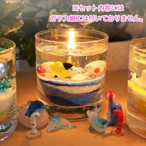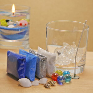 自分で作る!キャンドル6点セットA01(グラス、芯、カラーサンド×4色(ホワイト、シルバー、ブルー、コバルト)、クリアジェル、ビー玉、貝殻) キャンドル 蝋燭 ろうそく ロウソク 自由研究 工作 プレゼント インテリア オリジナル 手作り 材料 キット
